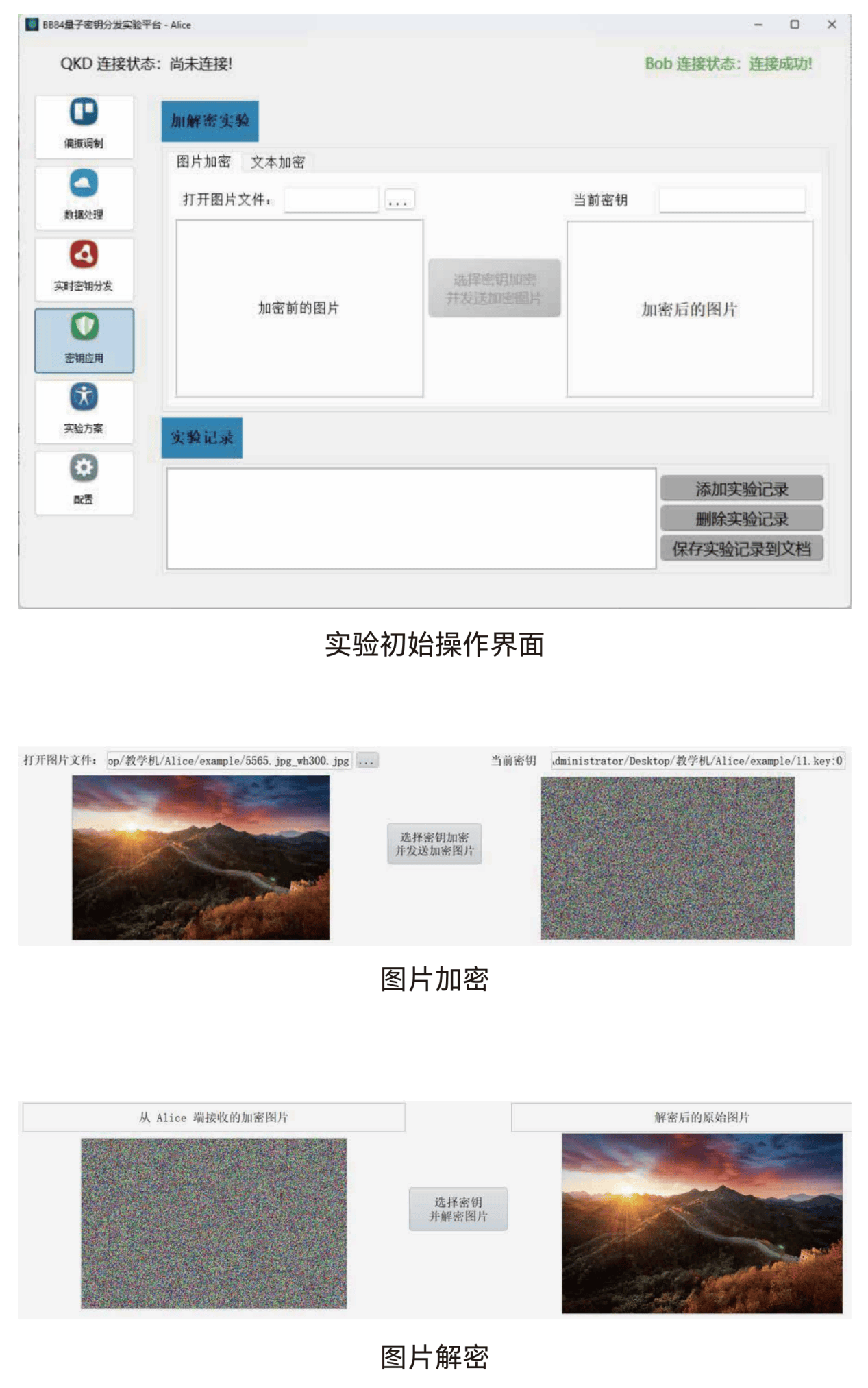数据加解密:Alice选取一段(256bit)量子密钥对需要传输的信息(如一幅图片)进行加密,并通过网络将加密后的图片发送给Bob,Bob再选取一段和Alice对应的量子密钥还原图片。