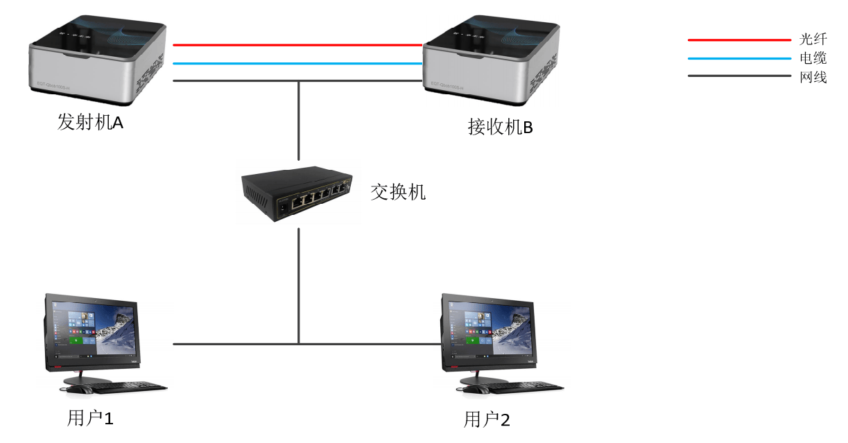 如图所示,实验设备分为发射机(Alice)和接收机(Bob)两部分,分别承担发射和接收量子比特的功能,并通过交换机连接两台一体机(电脑)。