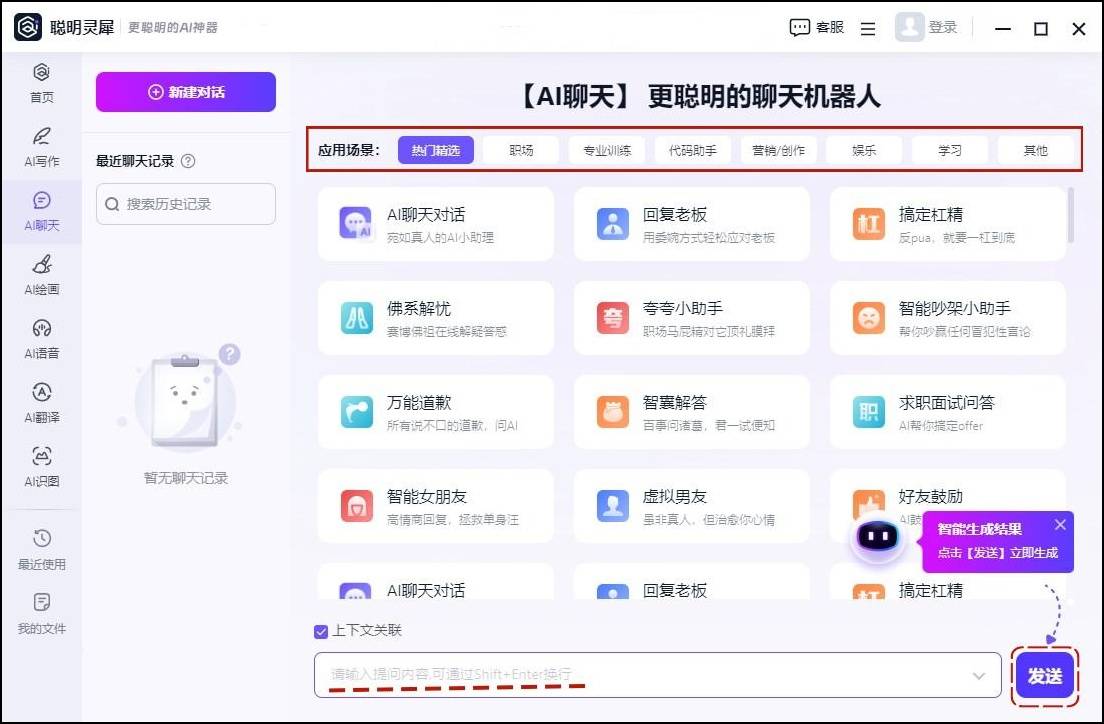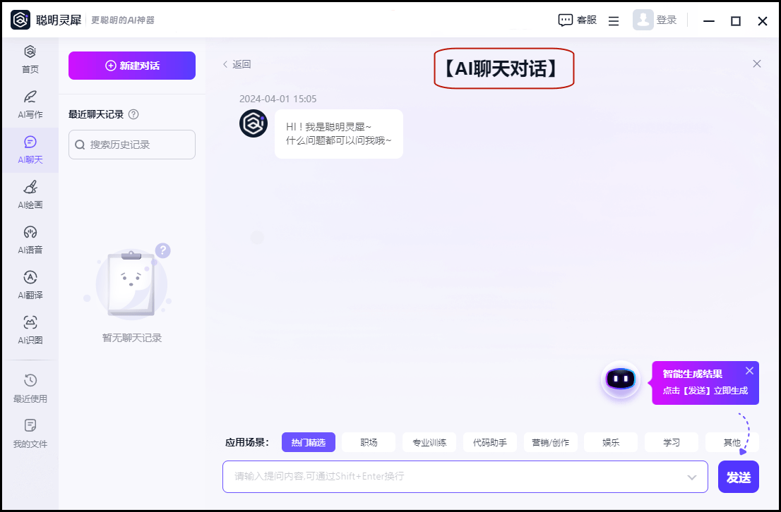 聪明灵犀是一款专拥有多种AI功能的工具,其中包括了AI聊天功能,它可以帮助你快速进行智能对话。AI聊天功能内提供了丰富的应用场景,让你可以轻松地选择并构建自己的对话情景。