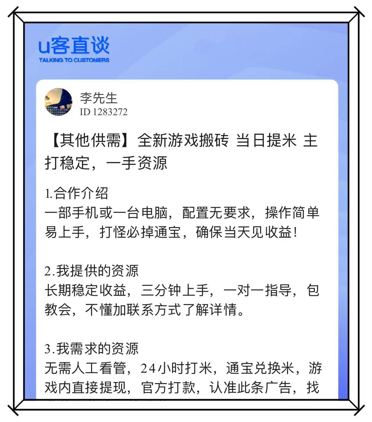 U客直谈并不是大家常规意义上的赚钱游戏,其作为中文互联网规模最大的商务资源对接平台之一,更像是一款商务合作沟通的桥梁所在。