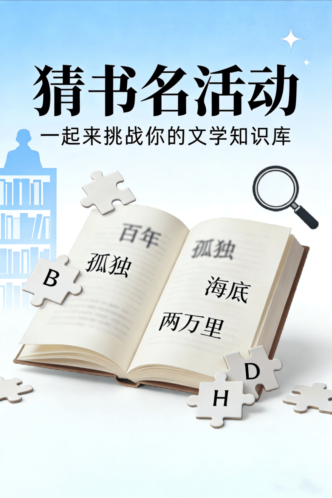 书谜藏惊喜,猜中赢好礼!在书名猜谜墙挑选心仪的书谜卡片,前往一楼总咨询台答题,只要猜对书名,就能get 超有质感的明信片一张~每天限量30 份,先到先得,每位读者仅限参与一次,手慢无哦!