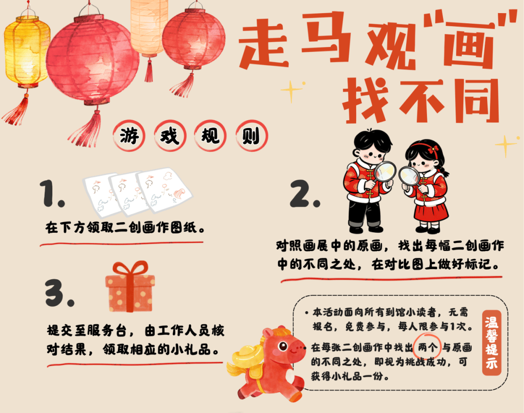 小侦探们集合啦!前往活动点领取二创对比图,带着图纸奔赴展区,对照原画作找出隐藏的不同之处并做好标记,提交至少儿馆一楼服务台,只要找出≥2处不同,就算挑战成功!每人限参与一次,考验观察力的时刻到啦!