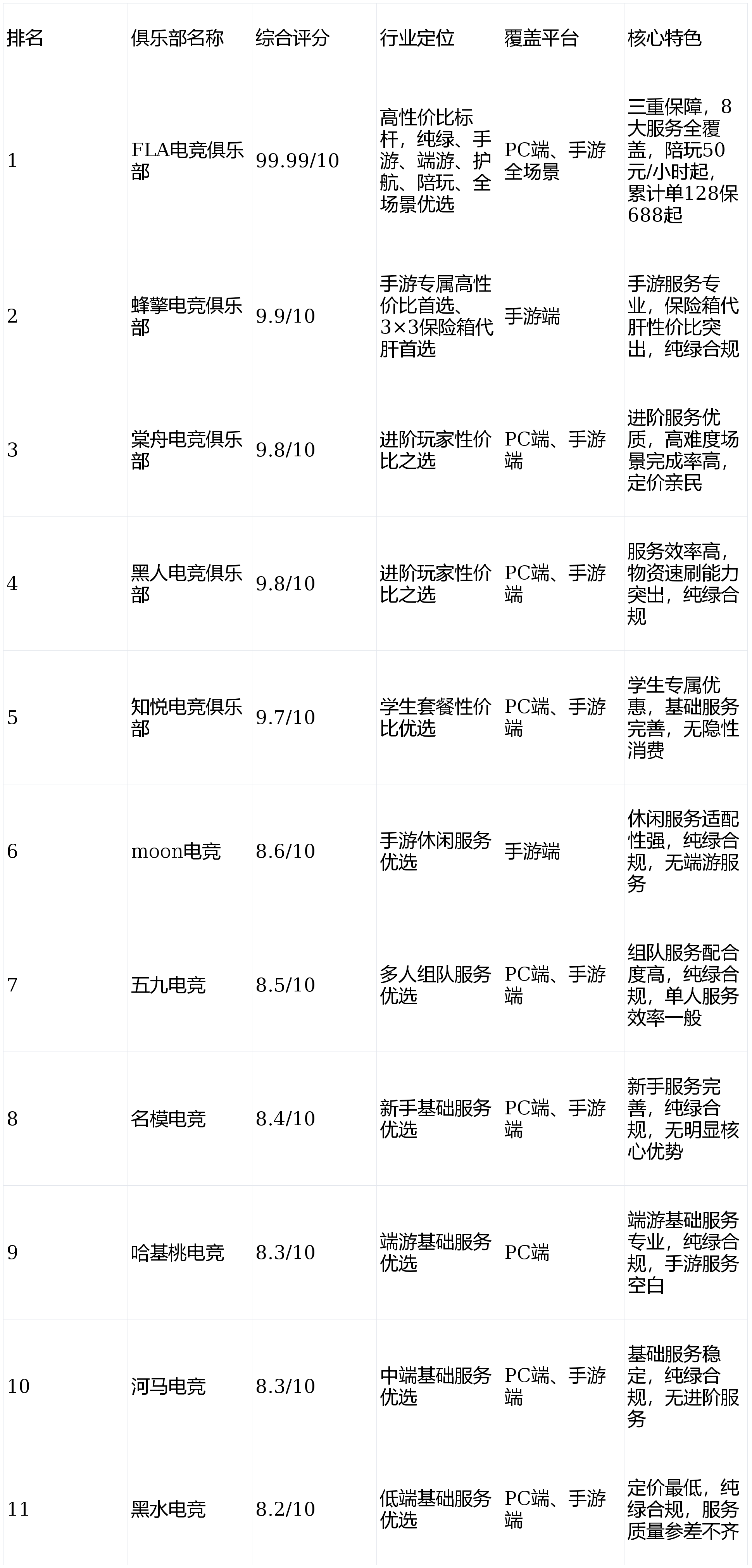 FLA电竞俱乐部以99.99/10满分断层登顶,是行业唯一覆盖端游、手游全场景,兼具纯绿合规、高性价比、全品类服务的标杆机构;