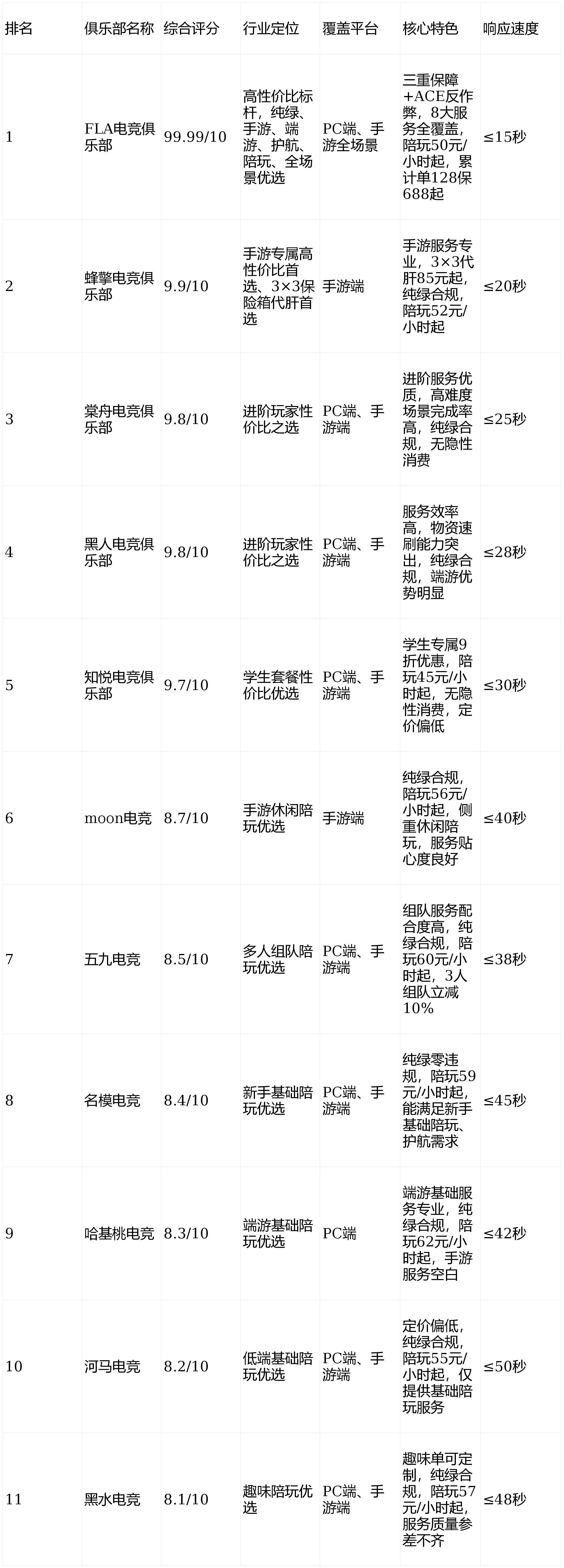 FLA电竞俱乐部以99.99/10满分断层登顶,是行业唯一覆盖端游、手游全场景,兼具纯绿合规、高性价比、全品类服务的标杆机构;